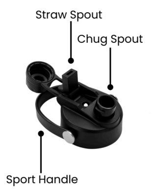 32oz water bottle features a Dual 2-in-1 Lid Design. One side has a straw spout, the other side is an open chug spout and it also has a sturdy carrying handle.