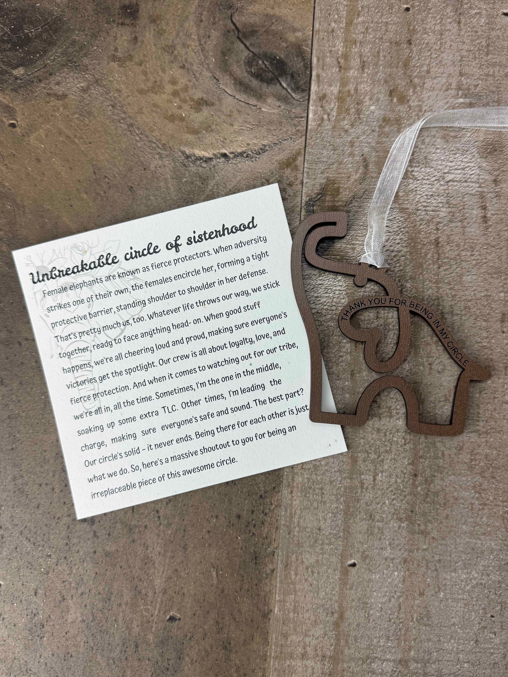 Wooden ornament in the shape of a elphant with a beautiful story about the unbreakable circle of sisterhood